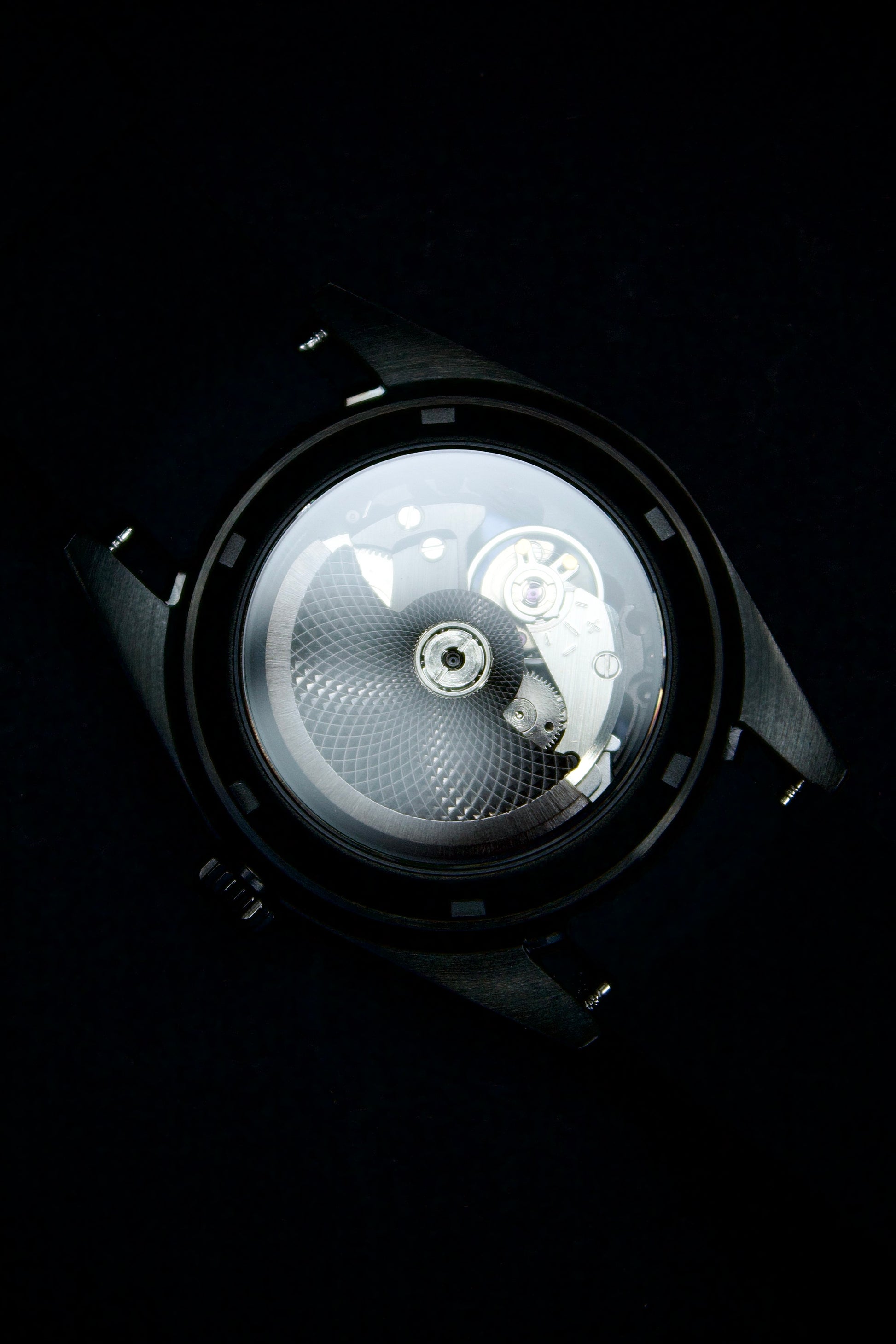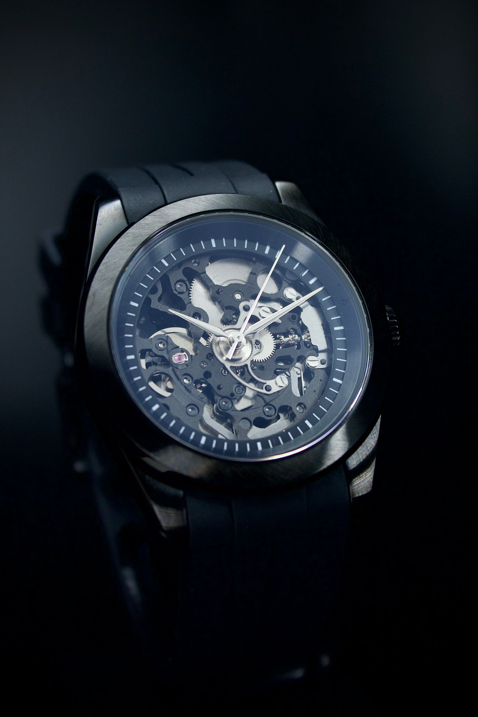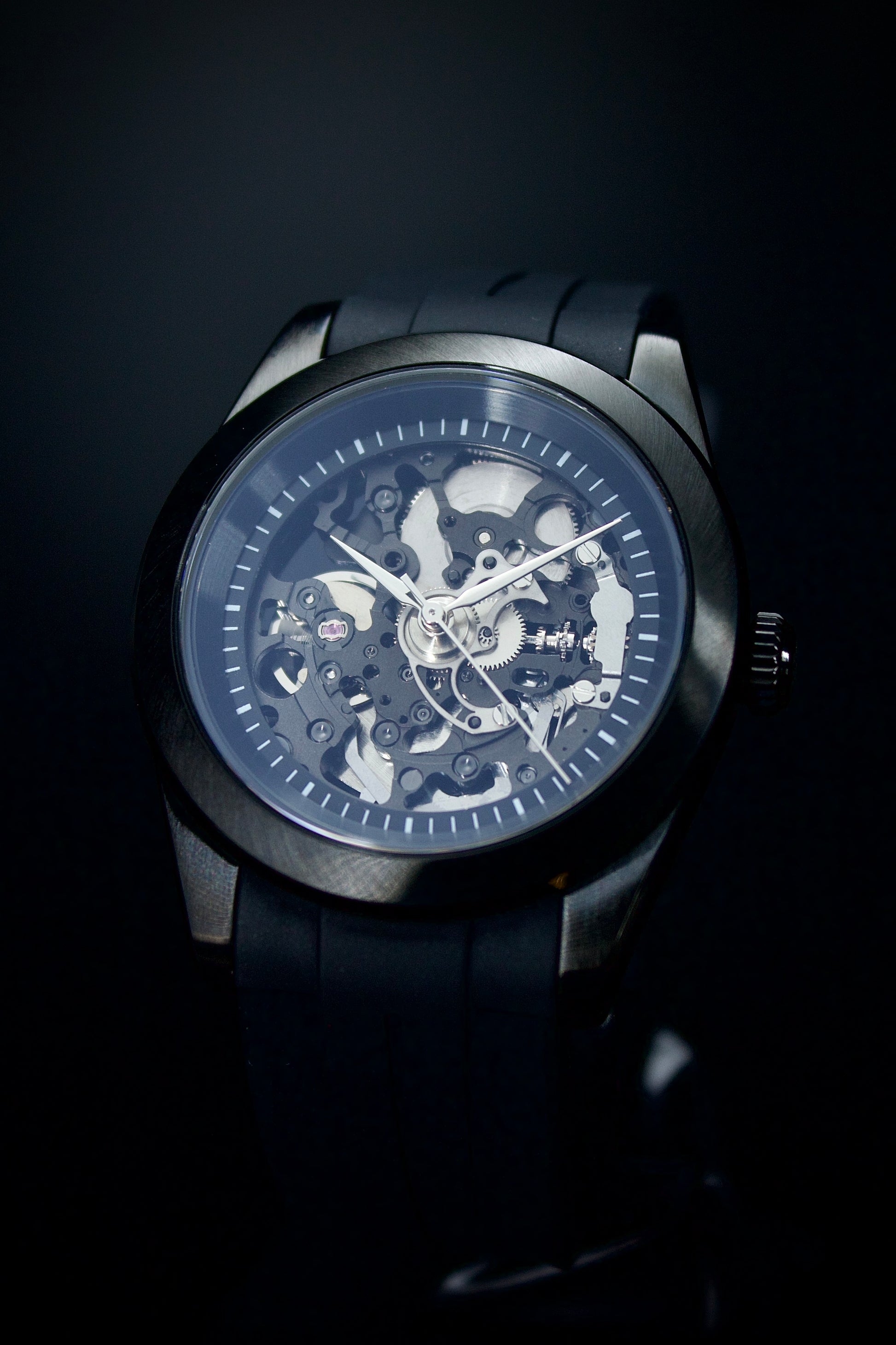 The open caseback extends the experience, turning the watch into a 360-degree study of mechanical depth. Paired with a supple, high-comfort rubber strap, the Phantom Noir delivers both presence and practicality in a design built for everyday wear.